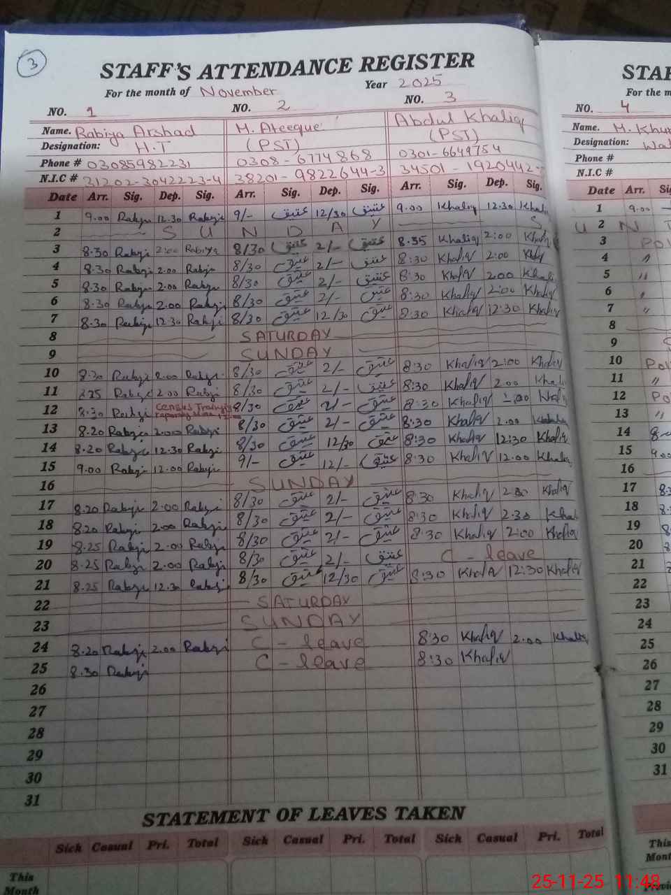 | CNIC | Full Name | Designation | R/C | Absence During Last Calender Month |