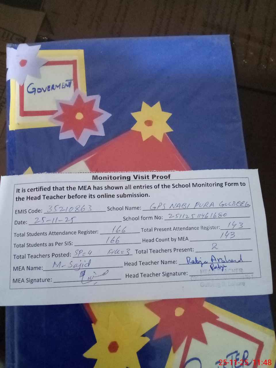 | Attendance Register | Head Teacher | MEA with School | Visit Proof |
