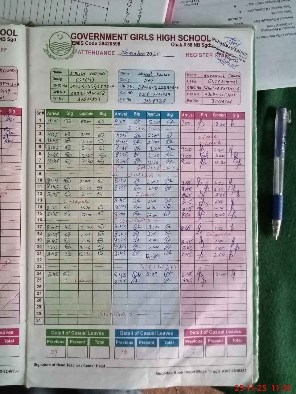 | CNIC | Full Name | Designation | R/C | Absence during last cal. month |