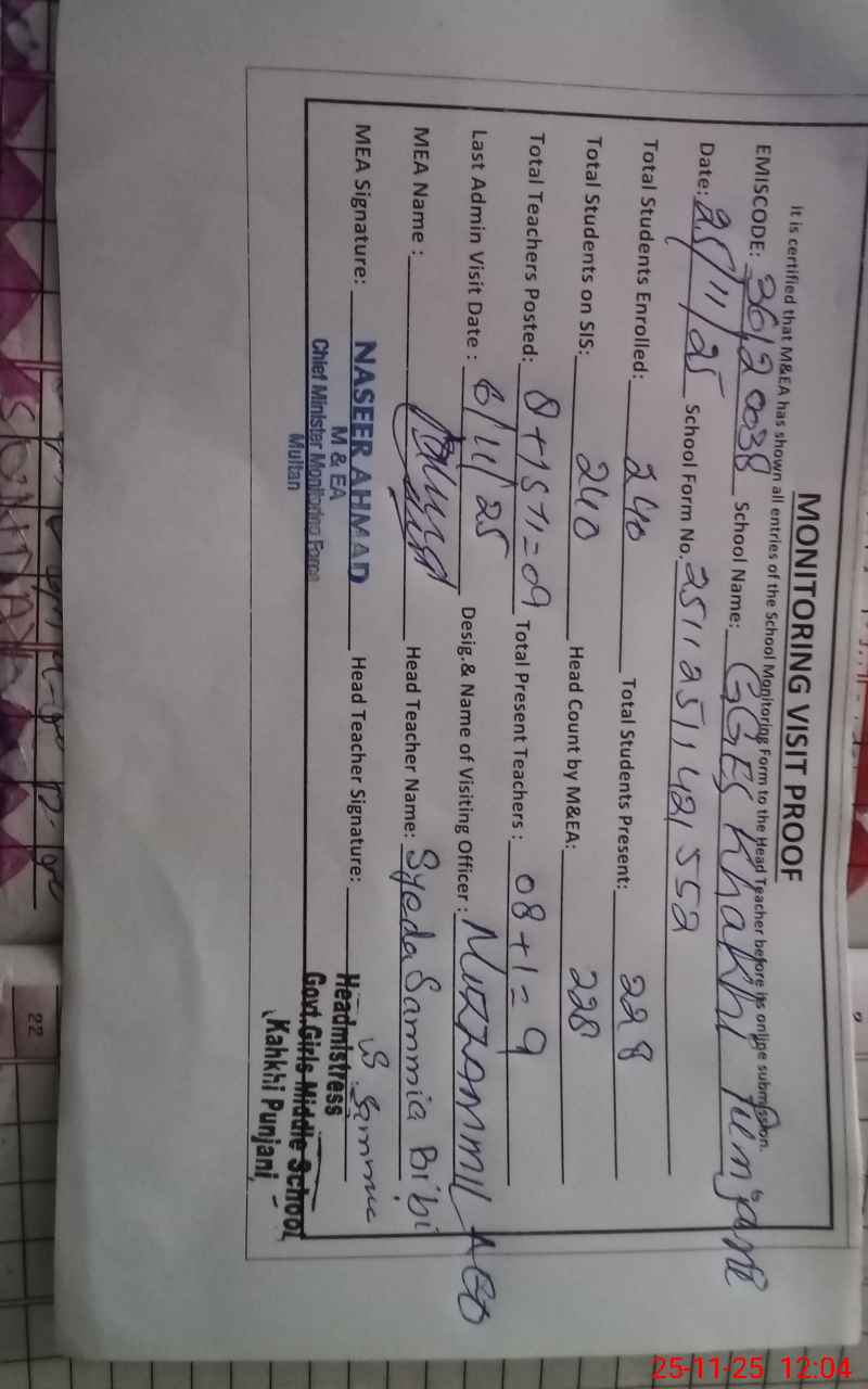 | EMIS Code: 36120038 | Name of School: GGES KHAKHI PUNJANI SHUJABAD | |||