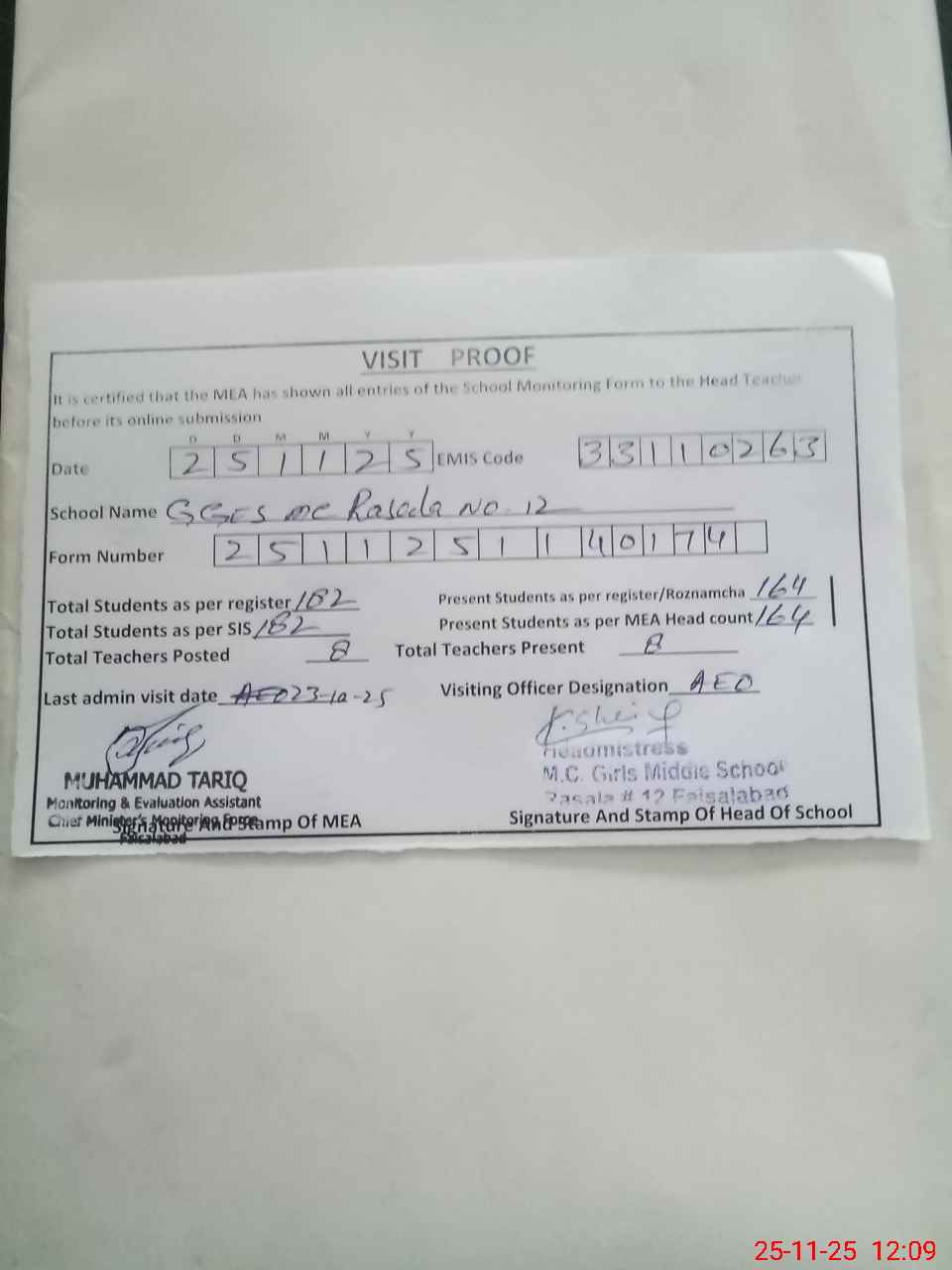 | Attendance Register | Head Teacher | MEA with School | Visit Proof |