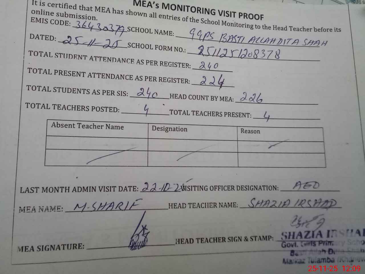 | Attendance Register | Head Teacher | MEA with School | Visit Proof |