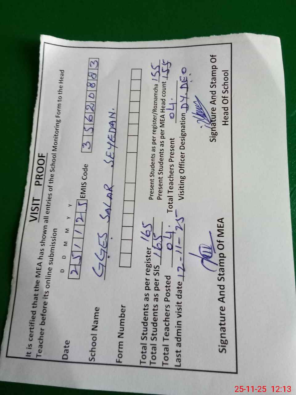| Attendance Register | Head Teacher | MEA with School | Visit Proof |