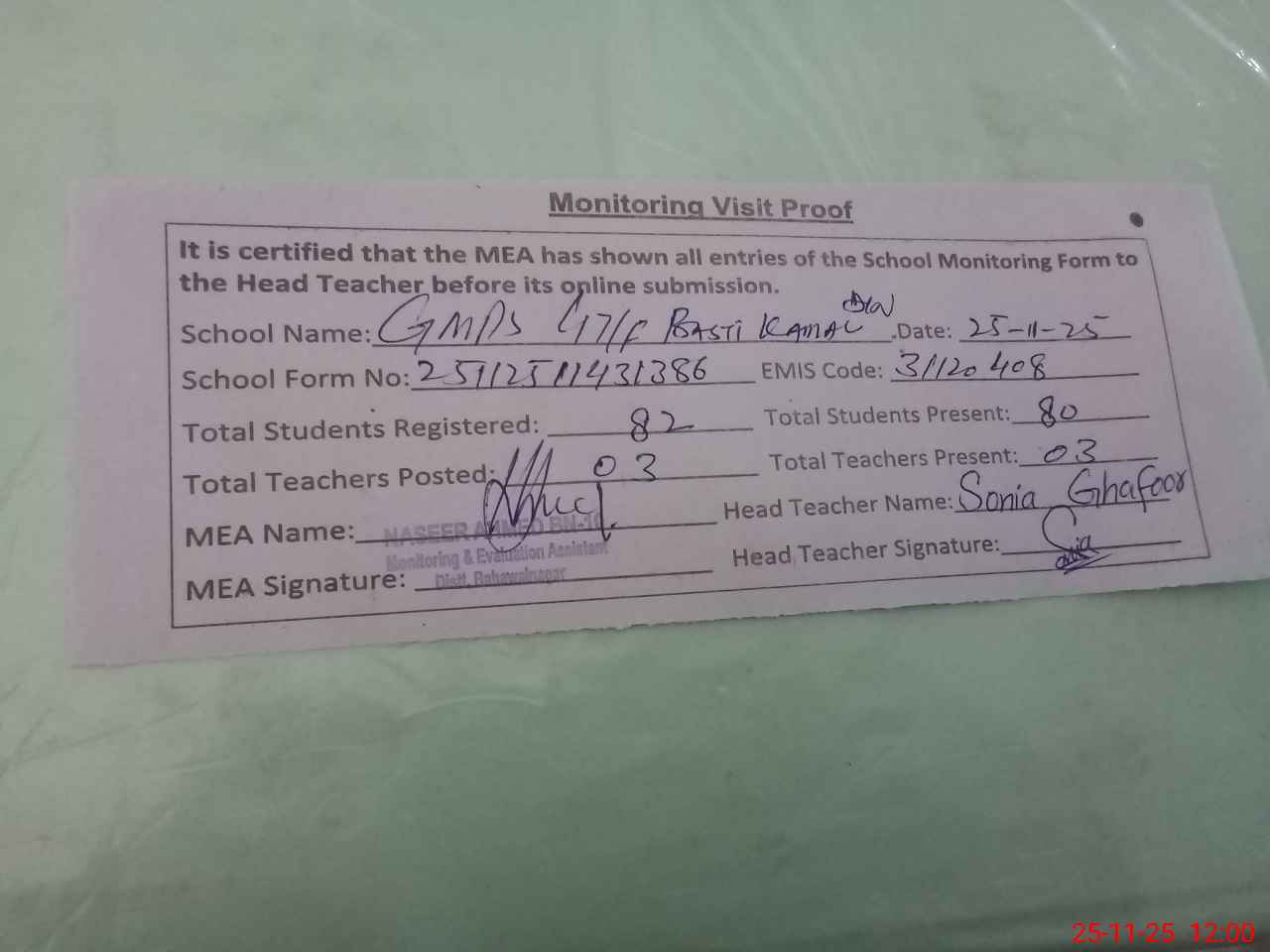 | Attendance Register | Head Teacher | MEA with School | Visit Proof |