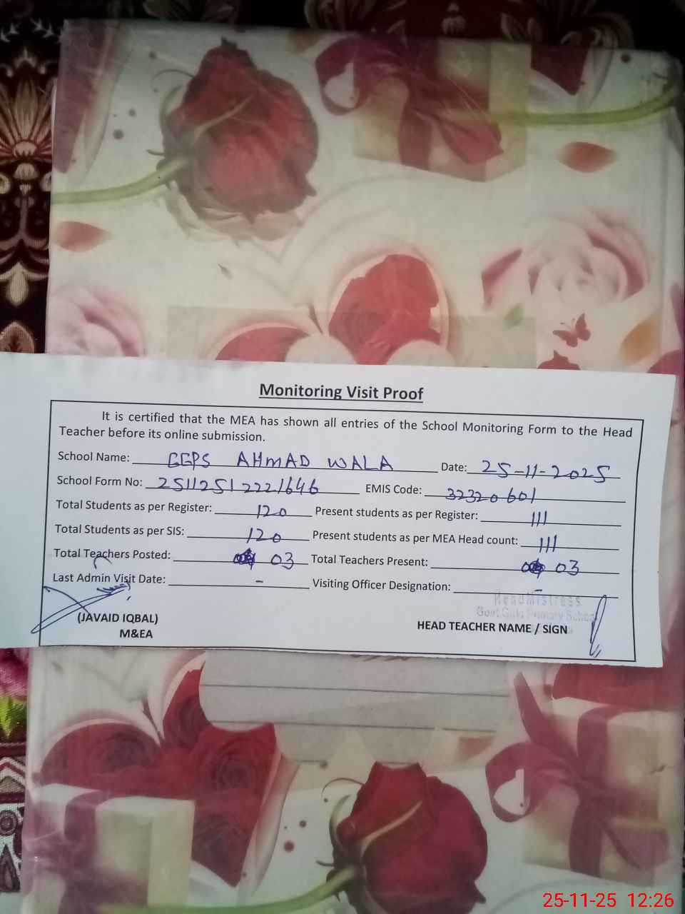 | Attendance Register | Head Teacher | MEA with School | Visit Proof |