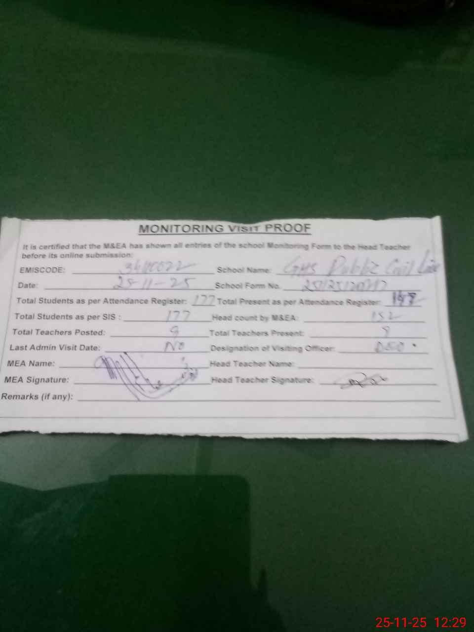 | Attendance Register | Head Teacher | MEA with School | Visit Proof |