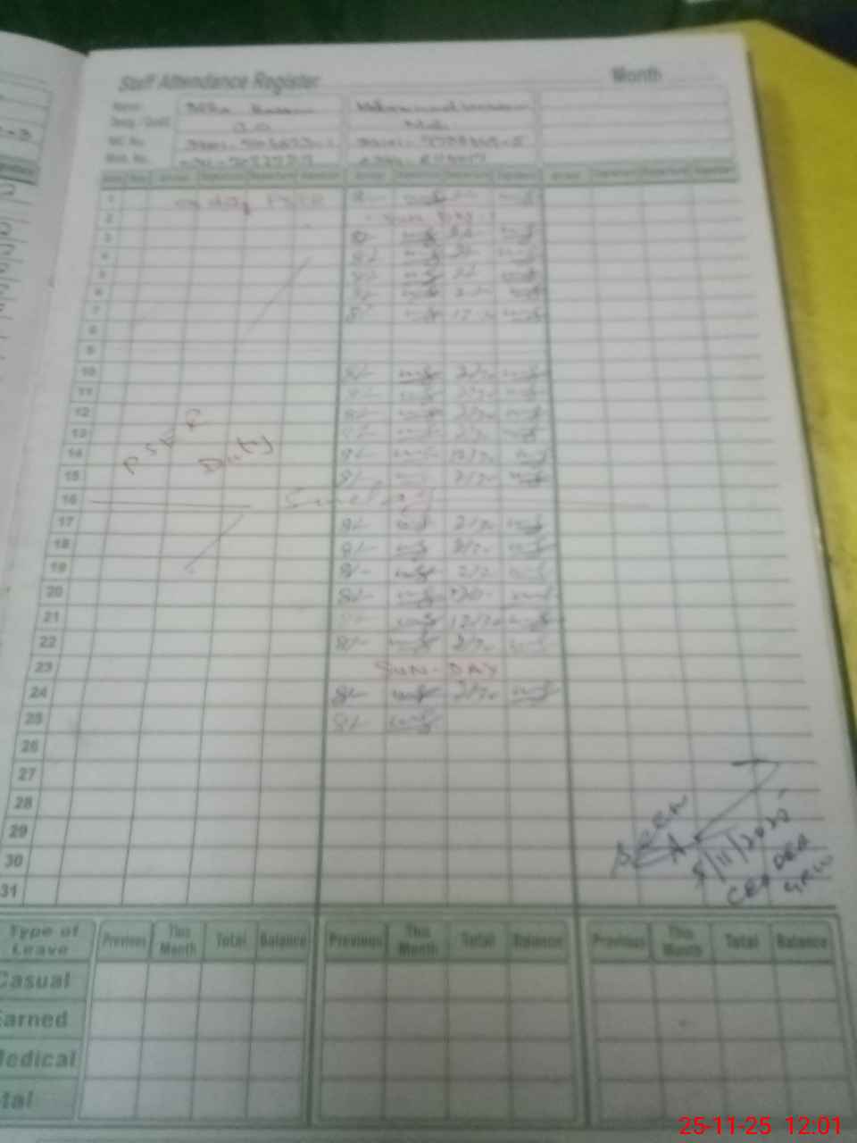 | CNIC | Full Name | Designation | R/C | Absence During Last Calender Month |