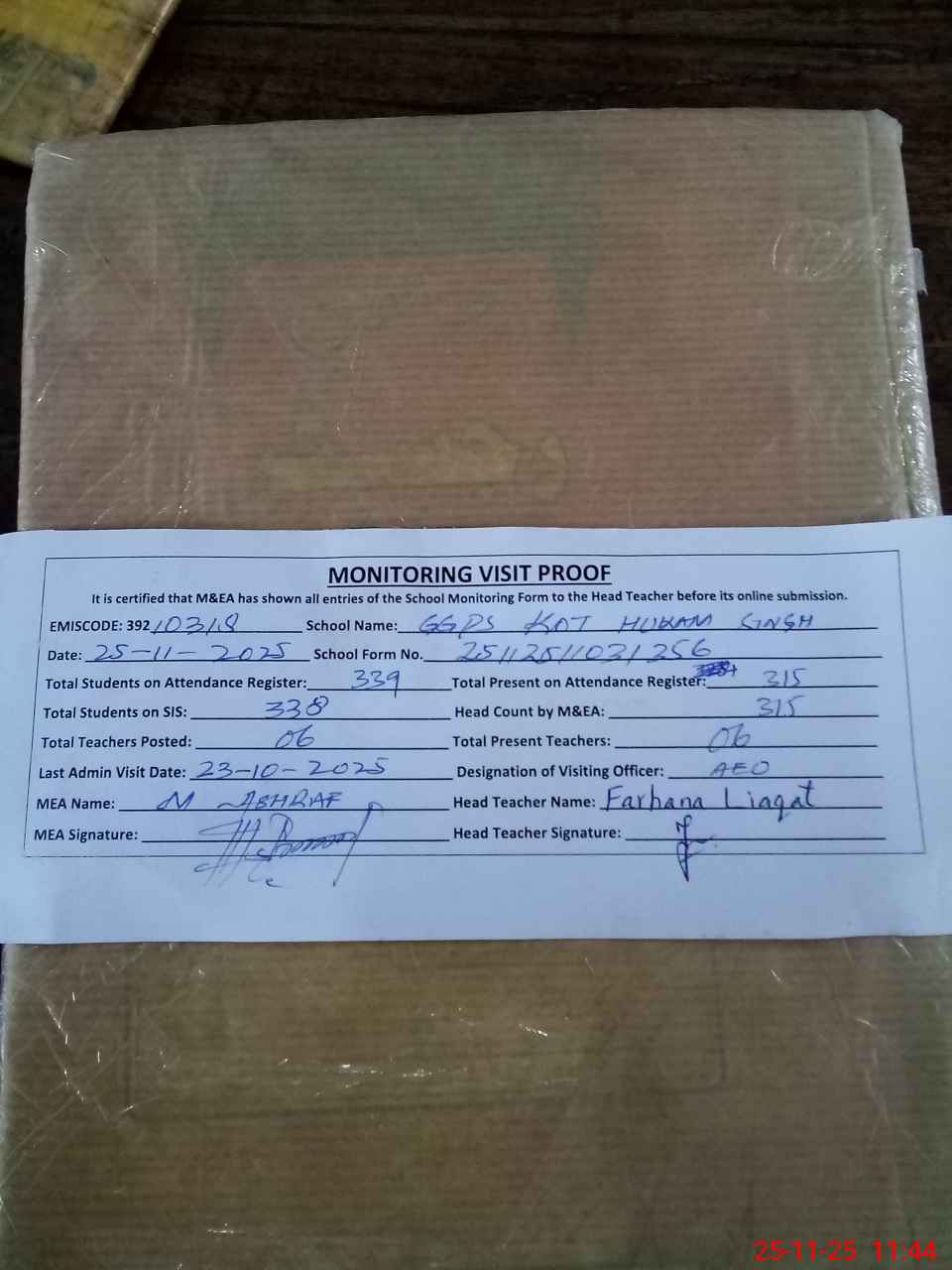 | Attendance Register | Head Teacher | MEA with School | Visit Proof |