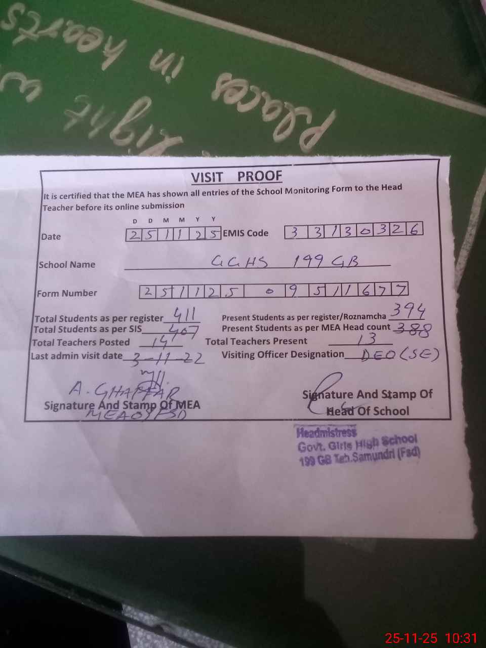 | Attendance Register | Head Teacher | MEA with School | Visit Proof |