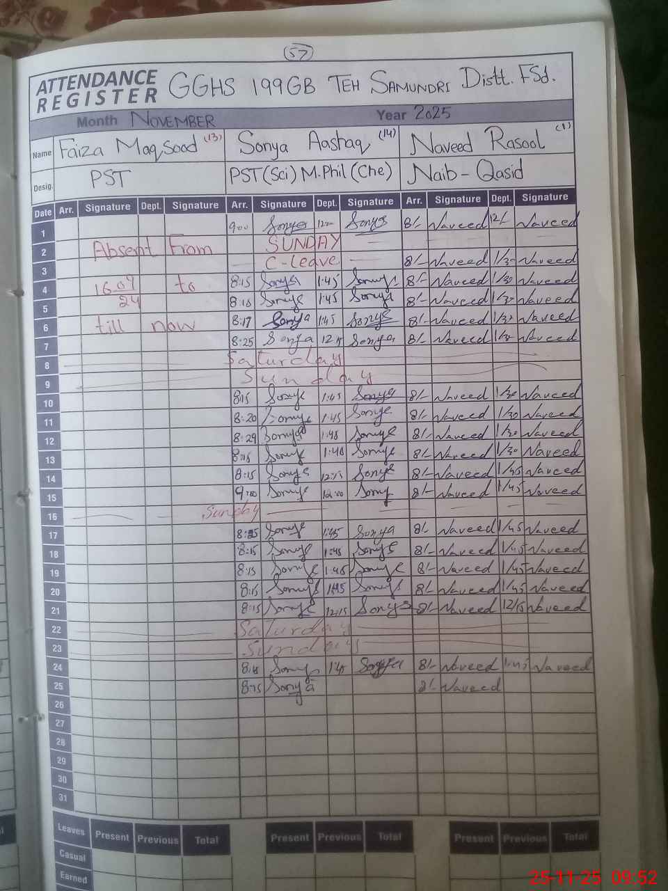 | CNIC | Full Name | Designation | R/C | Absence During Last Calender Month |