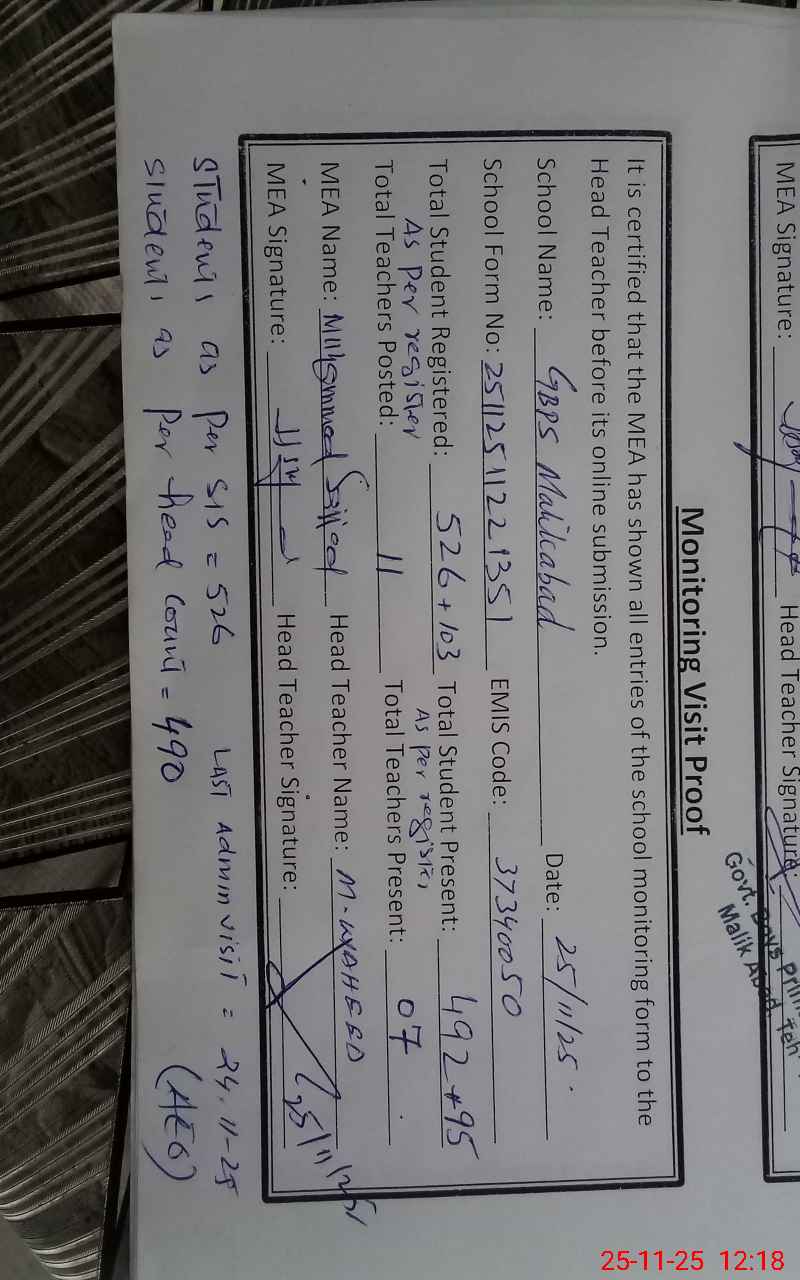 | Certified that this School was Inspected by the Undersigned MEA/DMO Today and the Information Stated Above is as Per Record. | |||||