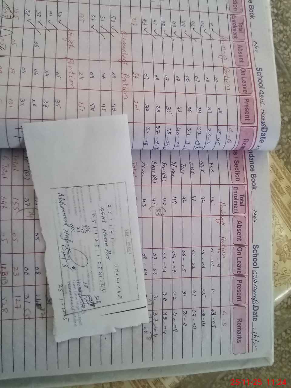 | Total no. of Classrooms: 15 No. of Classrooms Used for Teaching: 12 No. of Classrooms Storing Old Furniture, FTBs, etc: 0Comments if Any: Sir PST Tahira Batool was not present in school she applied leaves on 25 Nov after school open time at 0900 hrs she is absent PST Teacher Shakira Parveen was not present in school leave not apply timely she applied leave at 0900 hrs after school open ti |