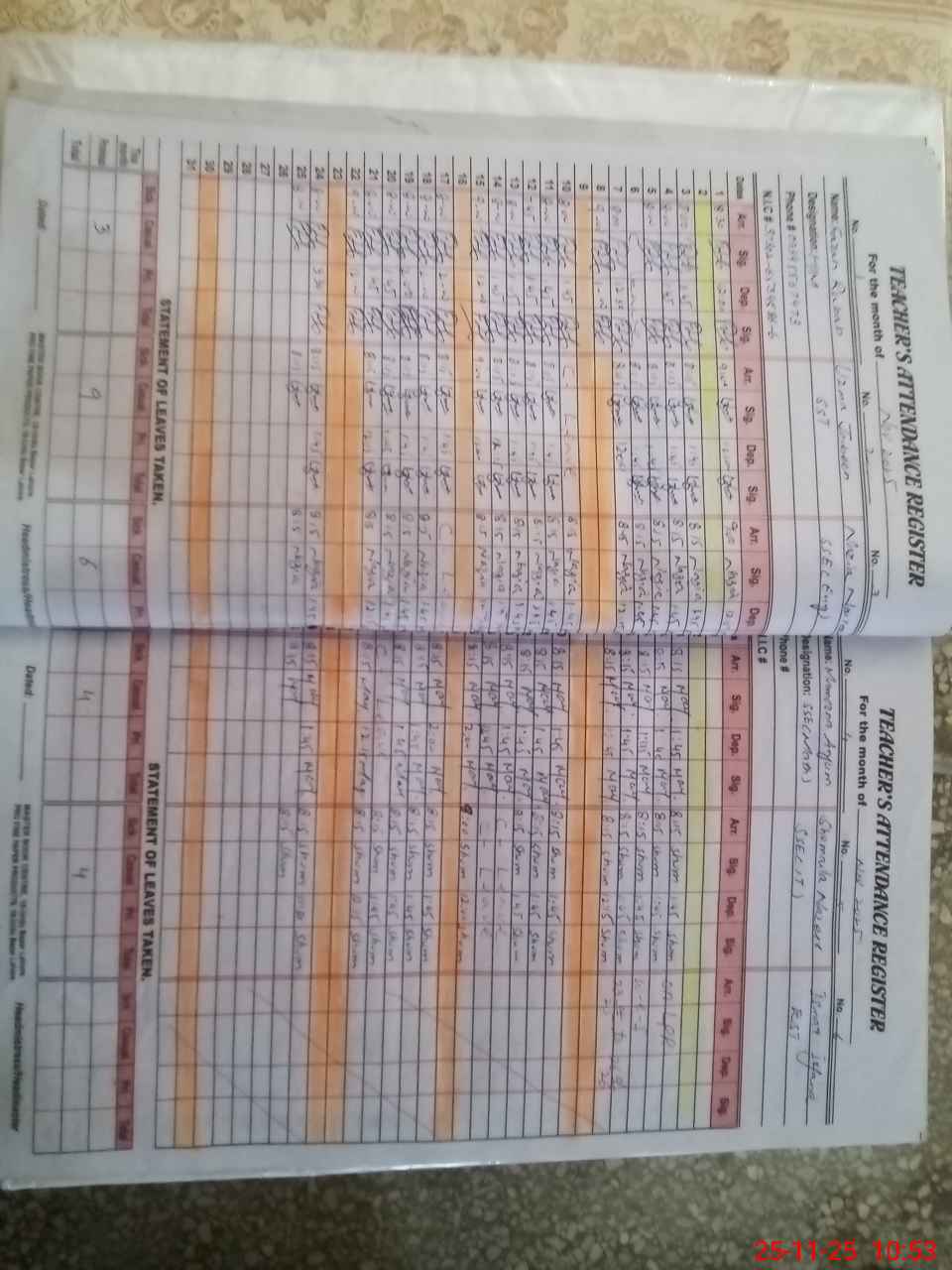 | Remarks (Use Separate Page if Required): Sir PST Tahira Batool was not present in school she applied leaves on 25 Nov after school open time at 0900 hrs she is absent PST Teacher Shakira Parveen was not present in school leave not apply timely she applied leave at 0900 hrs after school open time she is absent from school | |||||