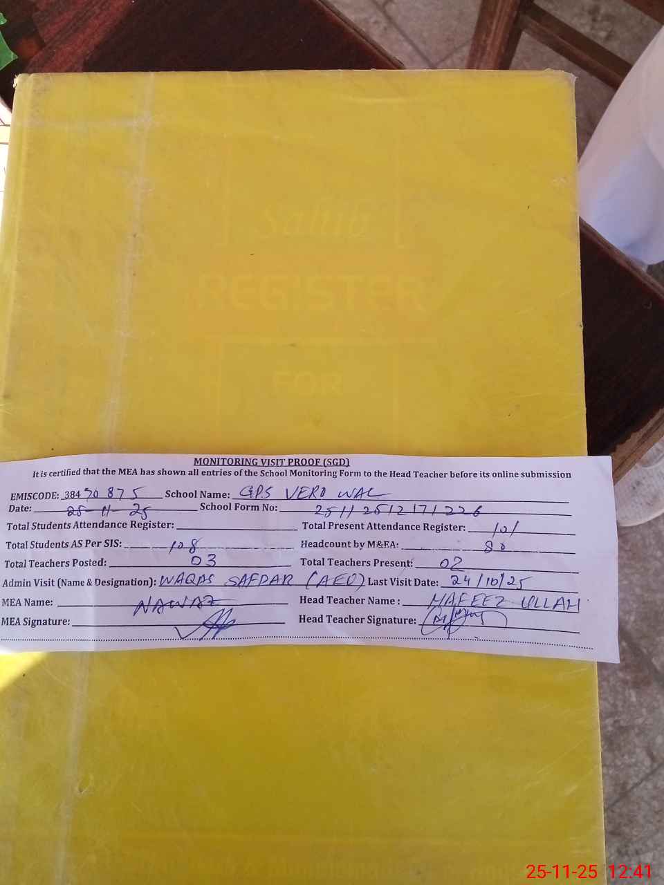 | Attendance Register | Head Teacher | MEA with School | Visit Proof |