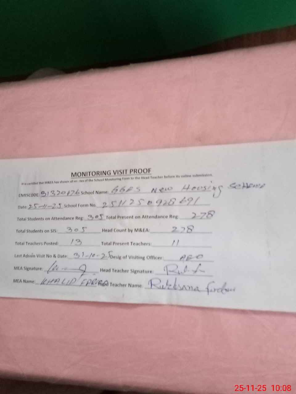 | Monitoring Date: 25-11-2025 | Start Time: 25-11-2025 09:28 AM | End Time: 25-11-2025 10:15 AM | Name of MEA: Kh**** Fa**** | |