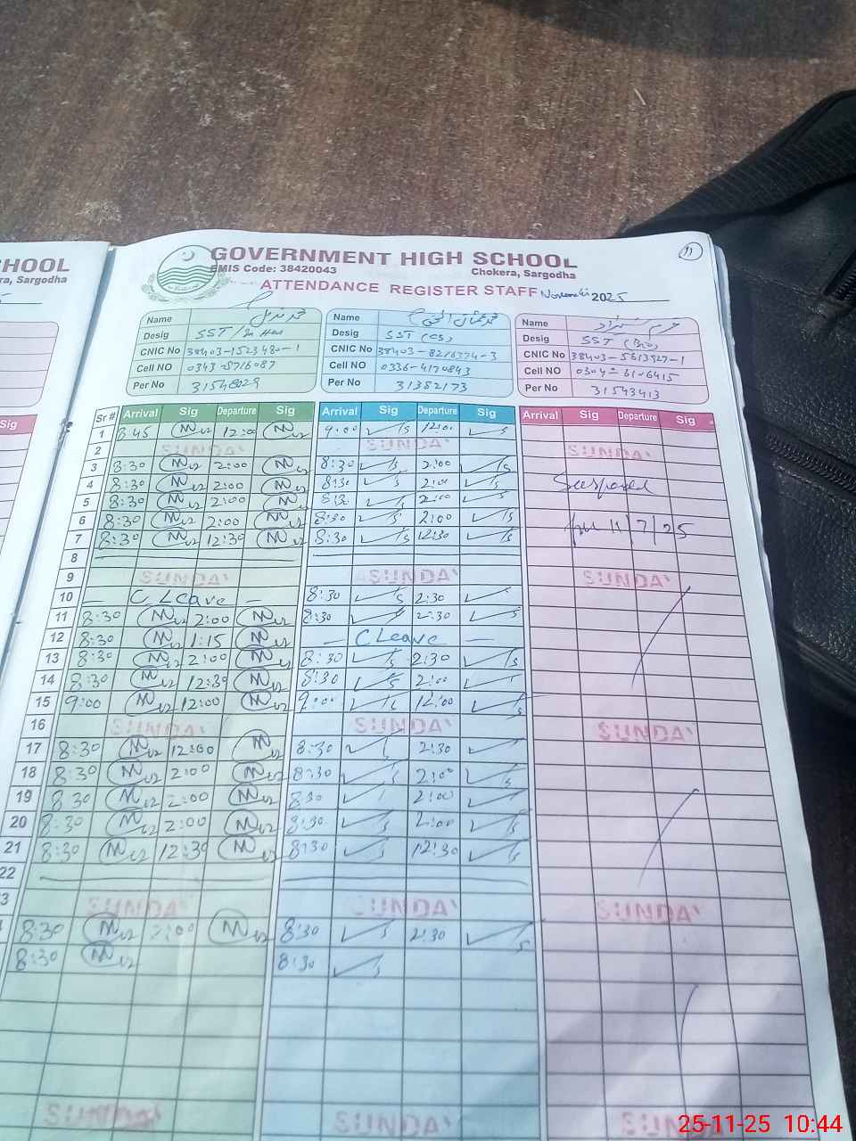 | CNIC | Full Name | Designation | R/C | Absence during last cal. month |