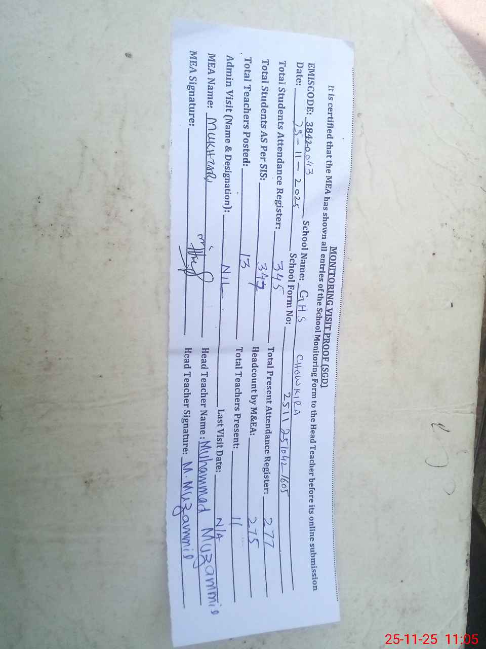 | Attendance Register | Head Teacher | MEA with School | Visit Proof |