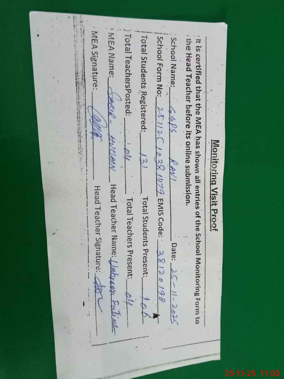| Remarks (Use Separate Page if Required): last visit by AEO SAIMA ASLAM on 04 11 2025 | |||||