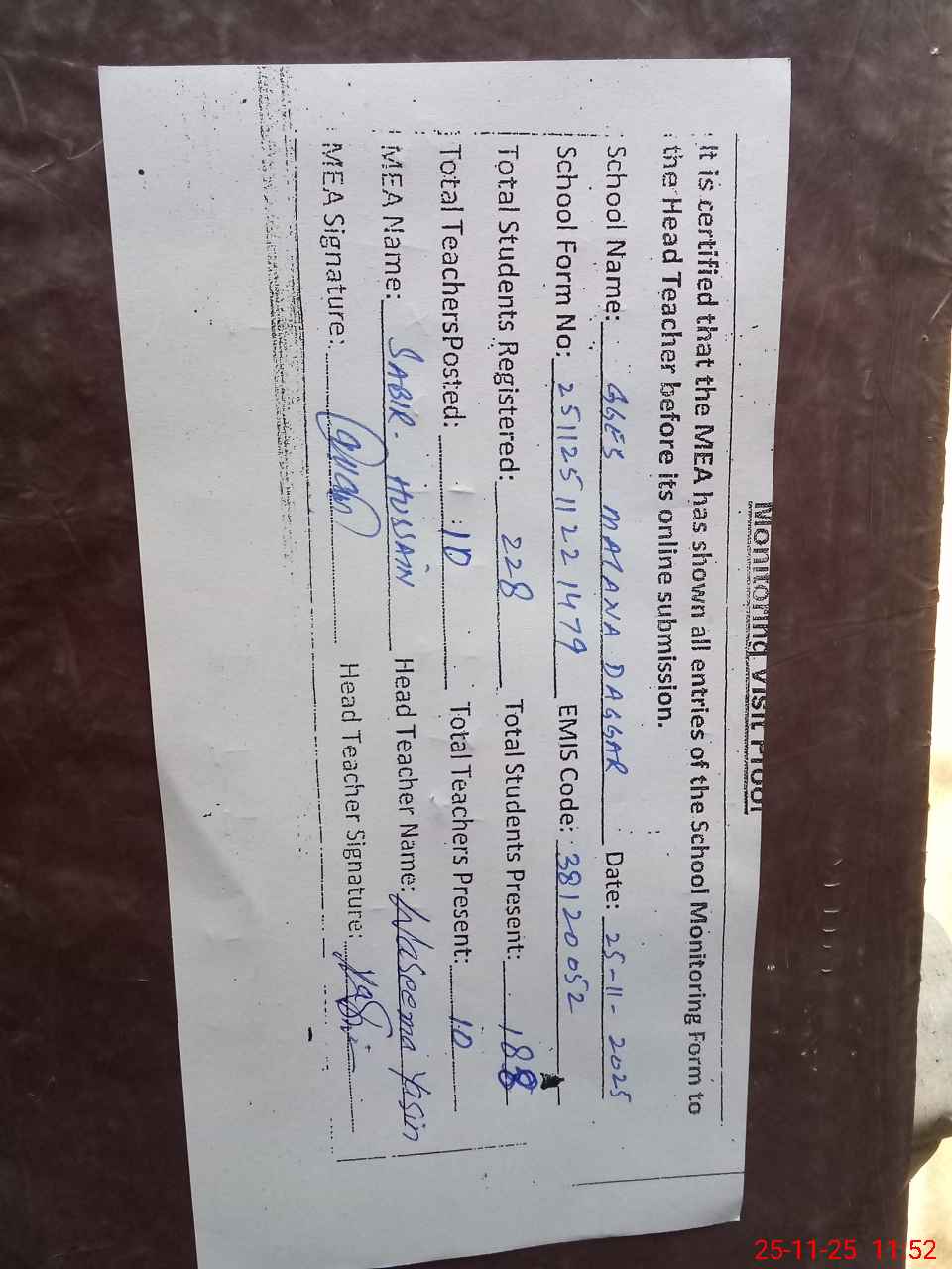| Remarks (Use Separate Page if Required): last visit by AEO ABDUL SALAM on 20 11 2025 | |||||