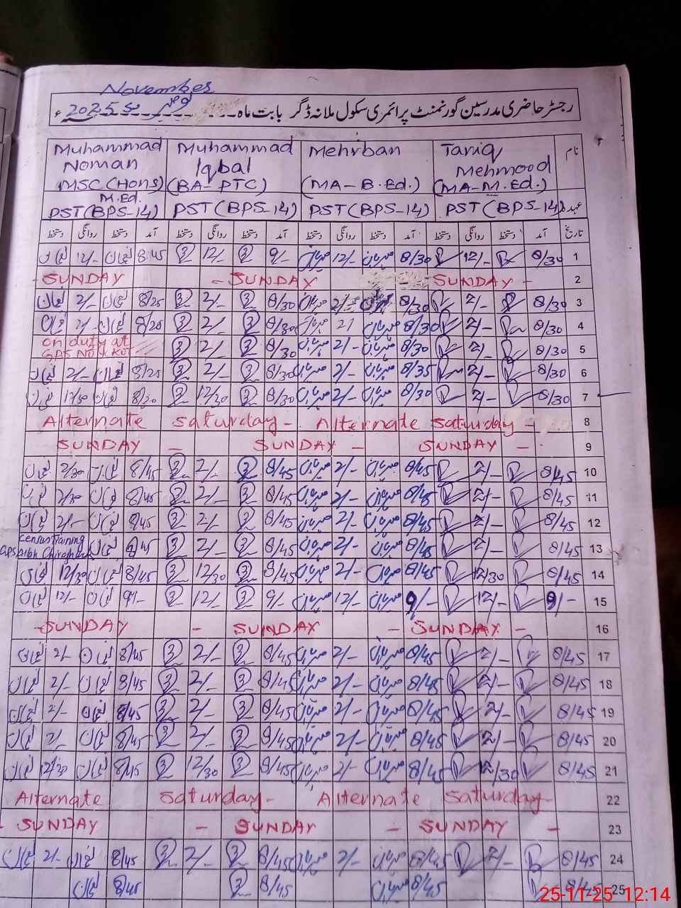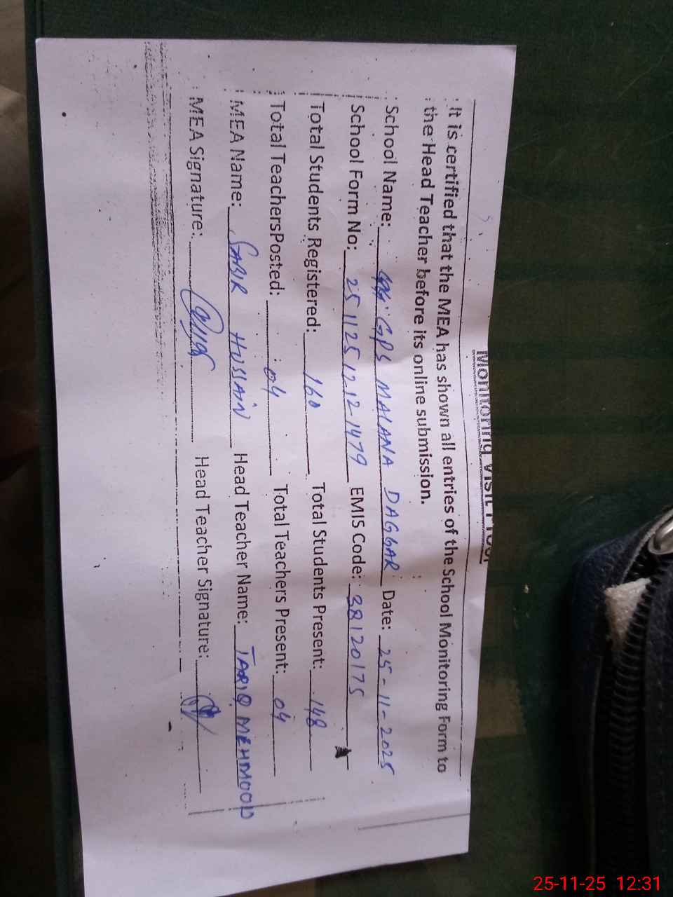 | Remarks (Use Separate Page if Required): last visit by AEO TAHIR IQBAL on 07 11 2025 | |||||