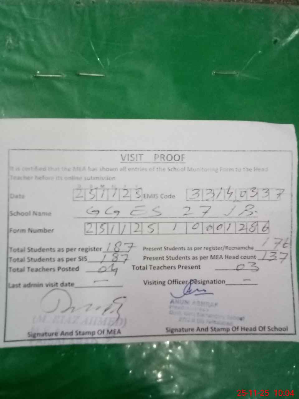| Attendance Register | Head Teacher | MEA with School | Visit Proof |