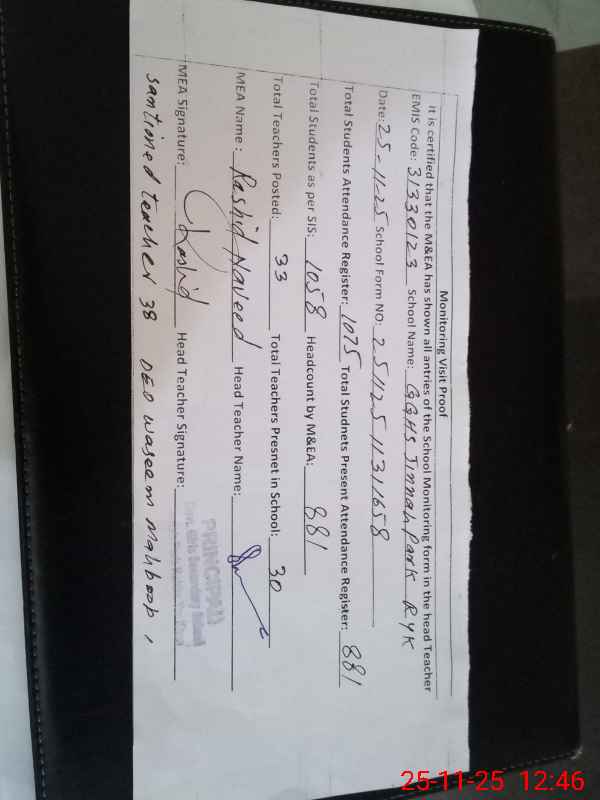 | Attendance Register | Head Teacher | MEA with School | Visit Proof |