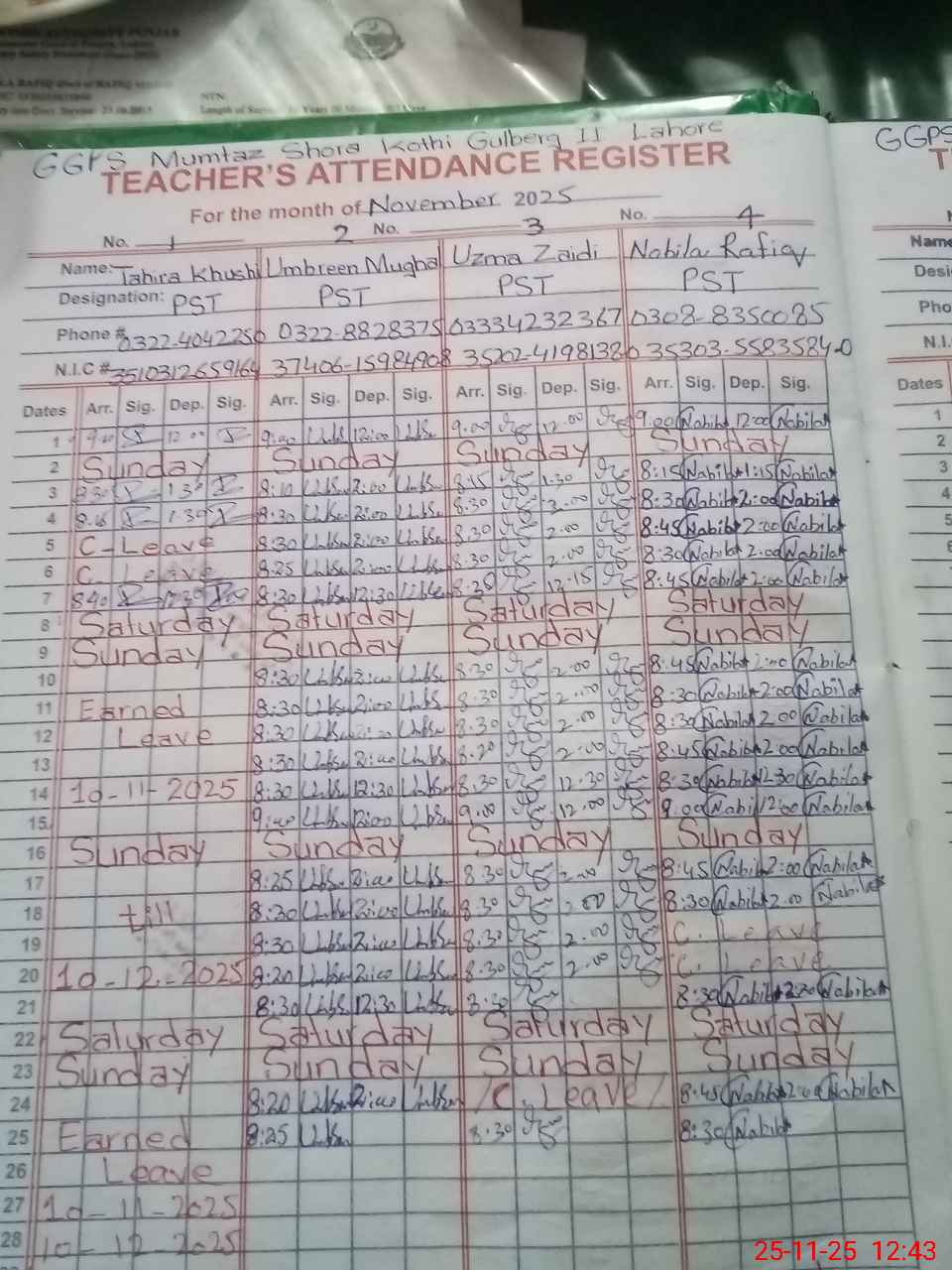 | CNIC | Full Name | Designation | R/C | Absence During Last Calender Month |