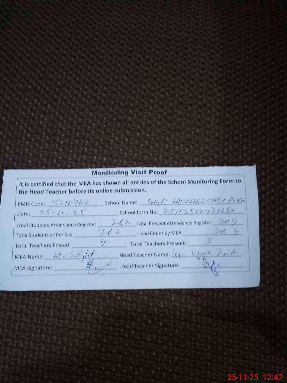 | Attendance Register | Head Teacher | MEA with School | Visit Proof |