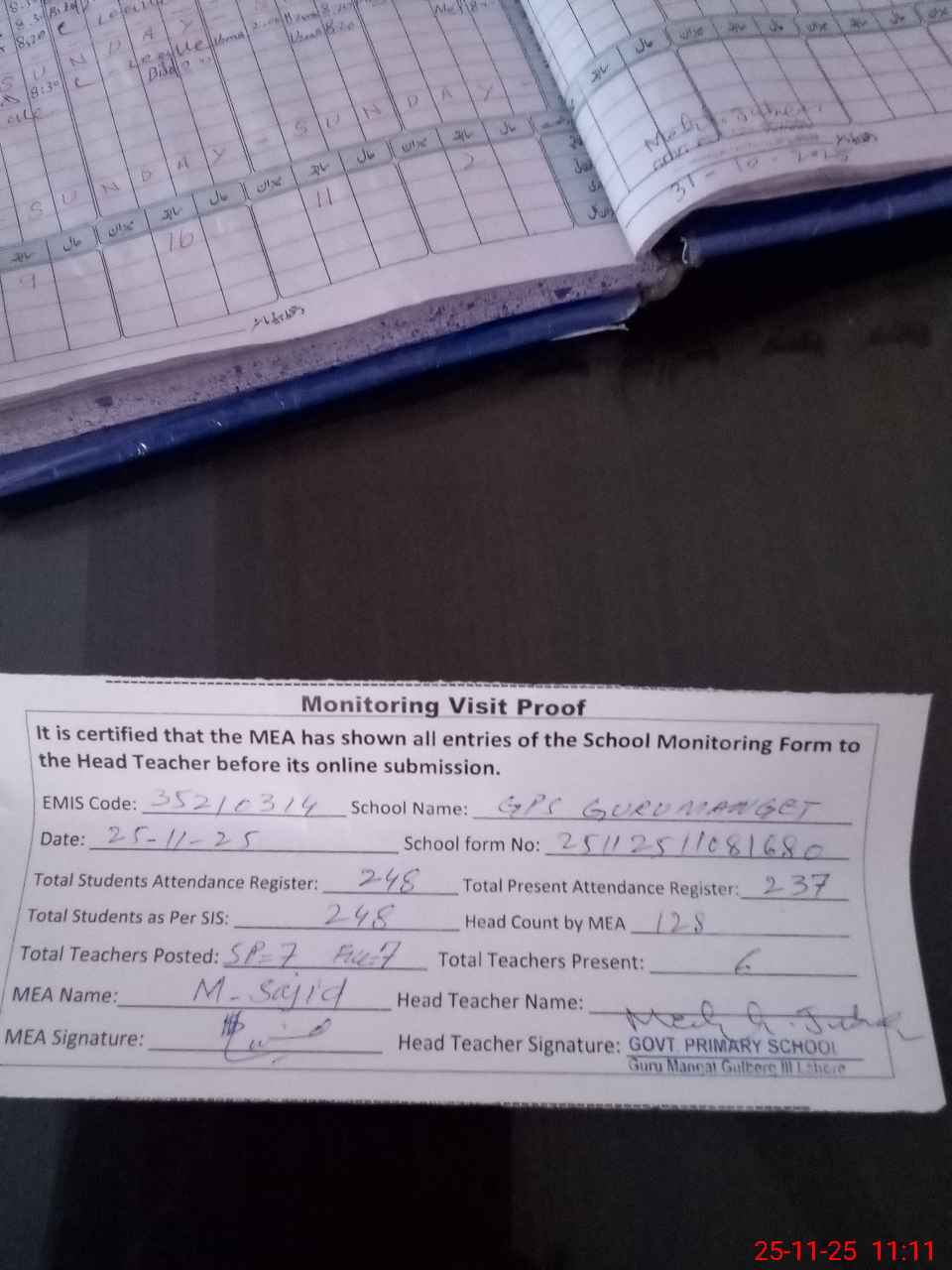 | Attendance Register | Head Teacher | MEA with School | Visit Proof |