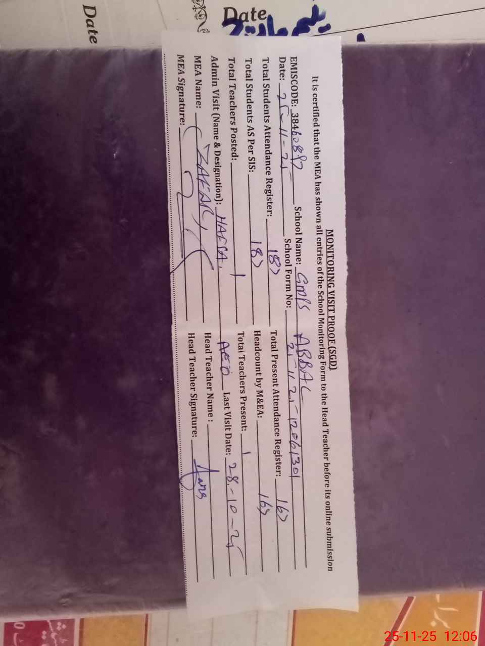 | Attendance Register | Head Teacher | MEA with School | Visit Proof |