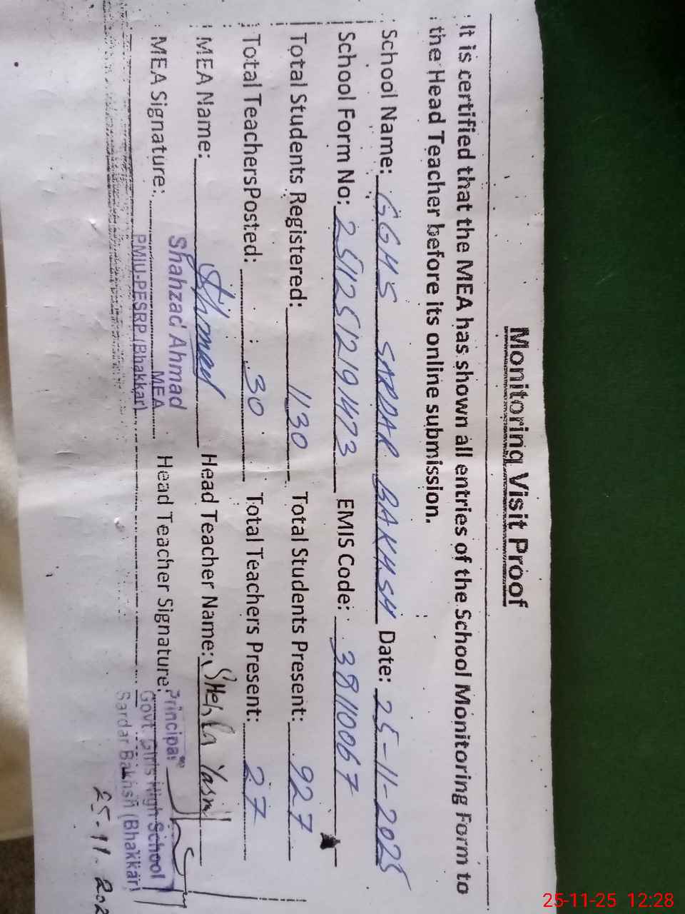 | Remarks (Use Separate Page if Required): Last visit Munir Ahmad Aulakh DEO SE 24 September 2025 NSB record is incomplete | |||||