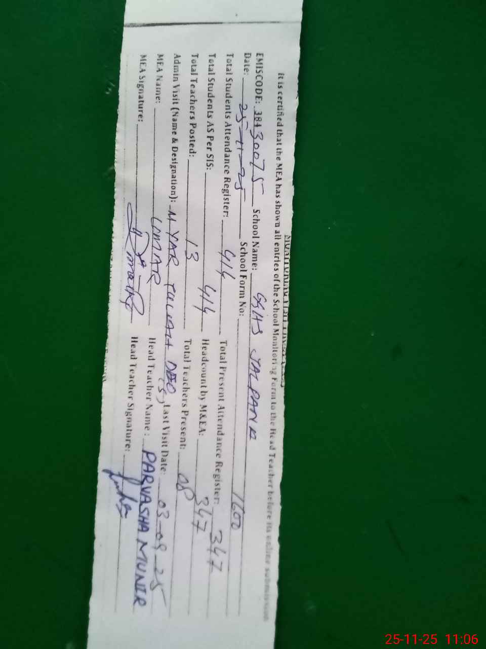 | Attendance Register | Head Teacher | MEA with School | Visit Proof |