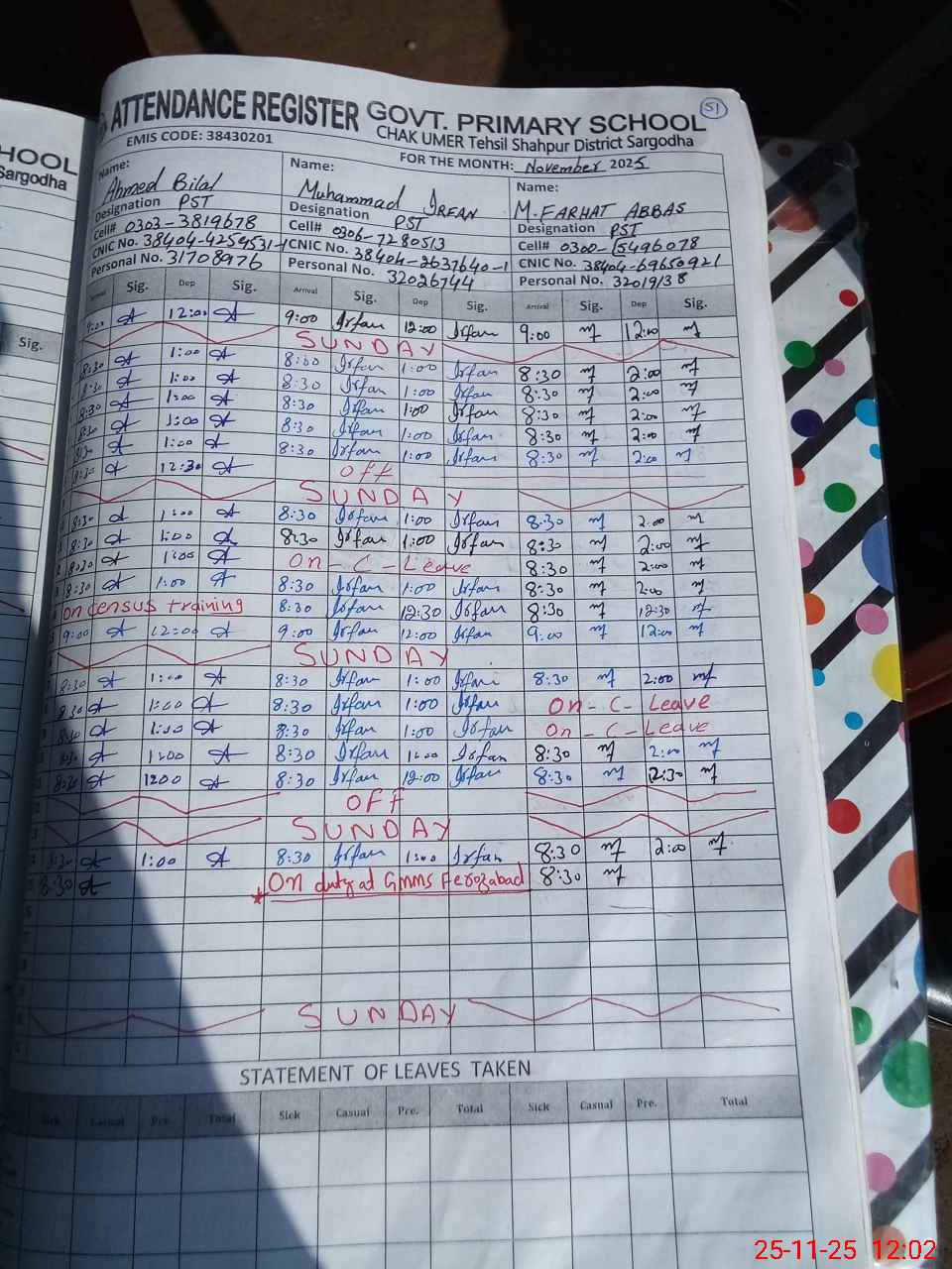 | CNIC | Full Name | Designation | R/C | Absence during last cal. month |