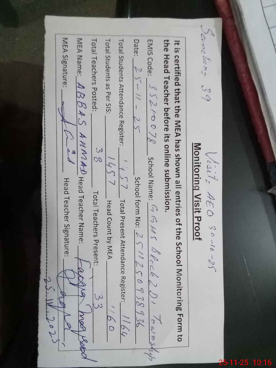 | Attendance Register | Head Teacher | MEA with School | Visit Proof |