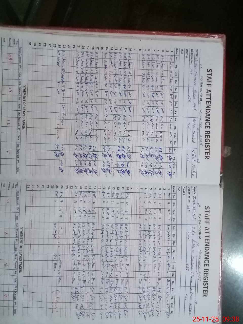 | CNIC | Full Name | Designation | R/C | Absence during last cal. month |