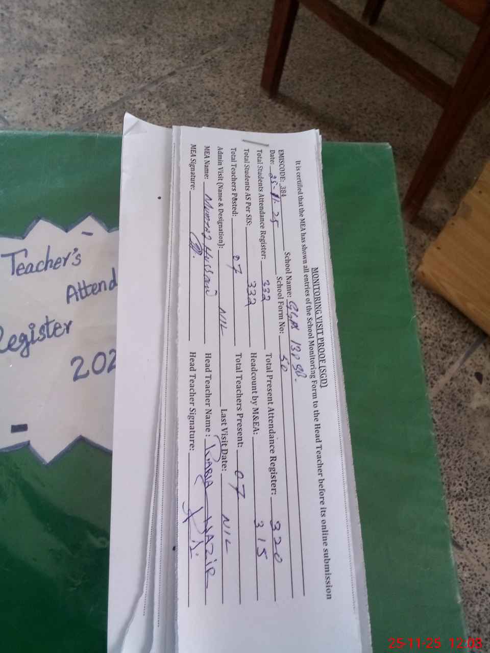 | Attendance Register | Head Teacher | MEA with School | Visit Proof |