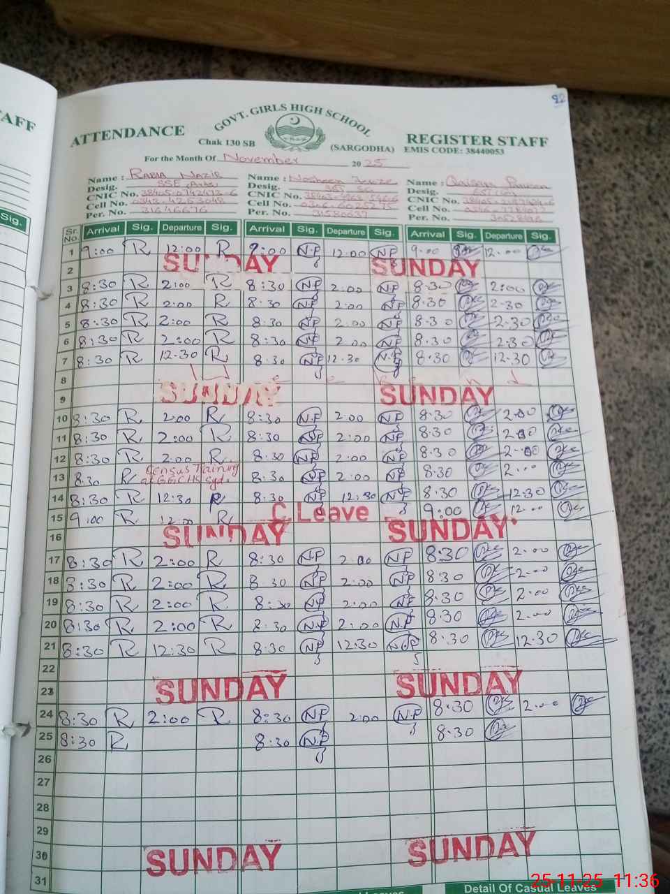 | CNIC | Full Name | Designation | R/C | Absence during last cal. month |