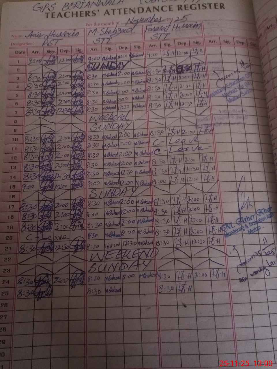 | CNIC | Full Name | Designation | R/C | Absence During Last Calender Month |