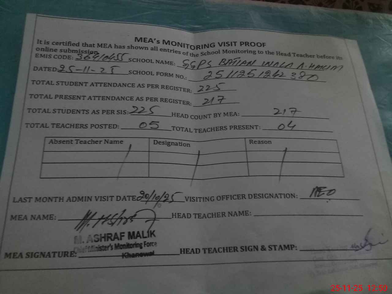 | EMIS Code: 36410455 | Name of School: GGPS BATIAN WALA, ABDUL HAKIM | |||