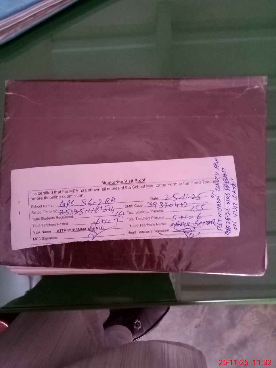 | Remarks (Use Separate Page if Required): Last admin visit by AEO on 05 November 2025 | |||||
