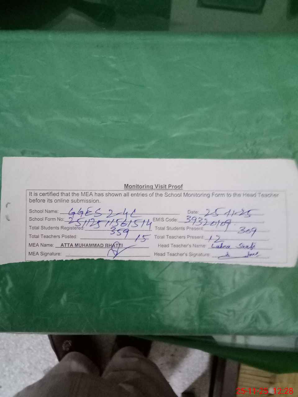 | Attendance Register | Head Teacher | MEA with School | Visit Proof |