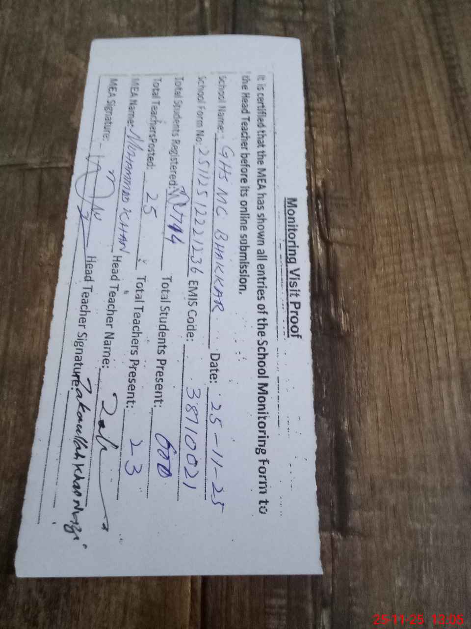 | Attendance Register | Head Teacher | MEA with School | Visit Proof |