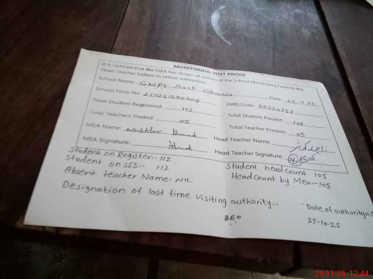 | Attendance Register | Head Teacher | MEA with School | Visit Proof |