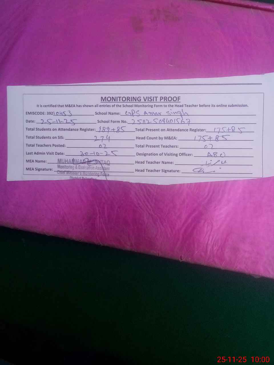 | Attendance Register | Head Teacher | MEA with School | Visit Proof |