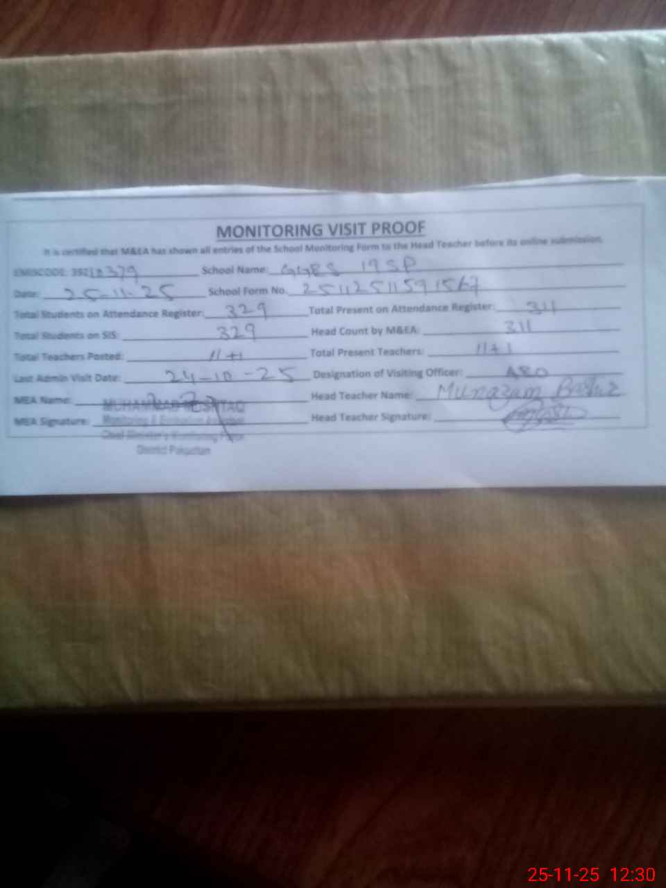 | Attendance Register | Head Teacher | MEA with School | Visit Proof |