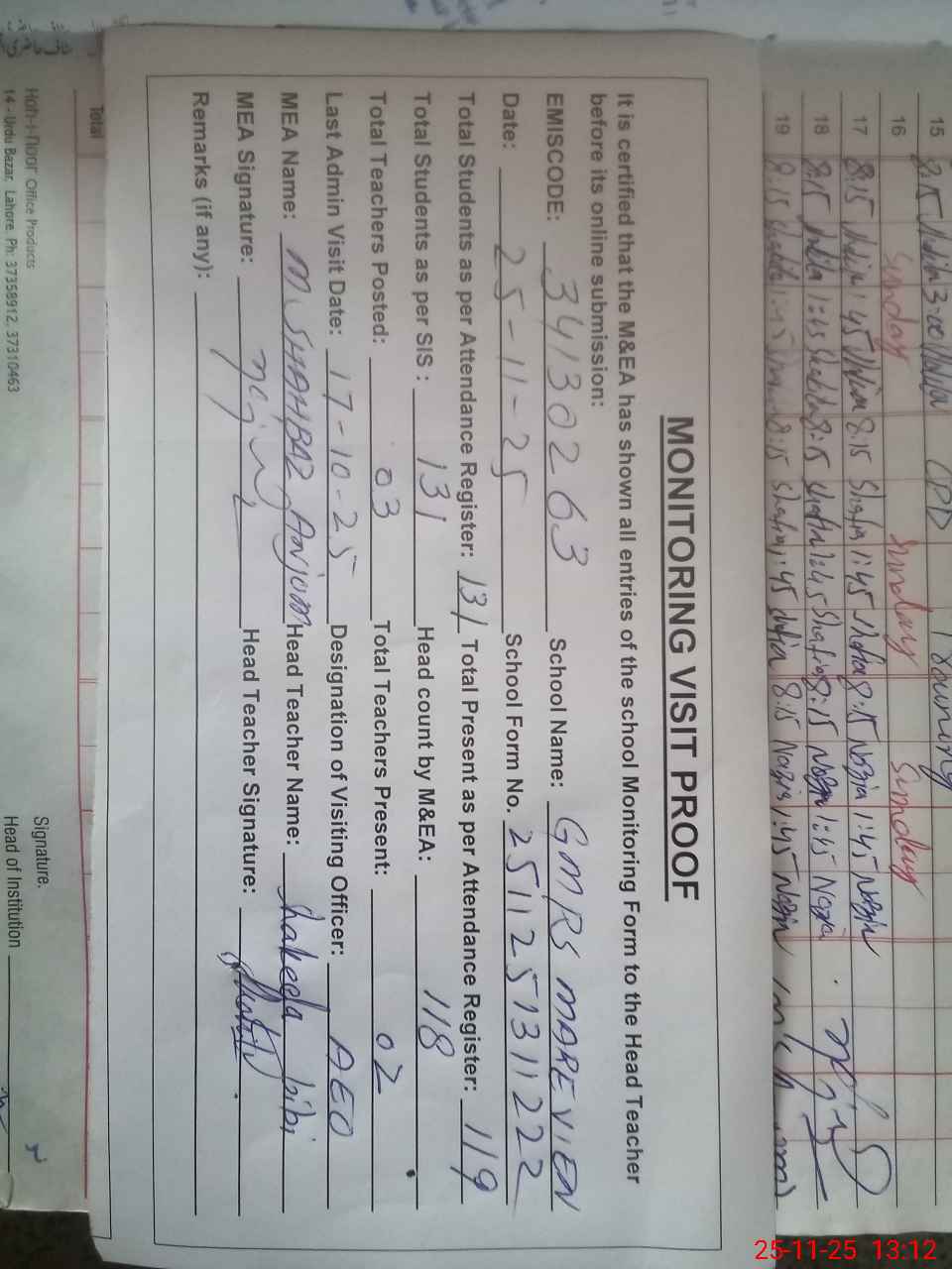 | Attendance Register | Head Teacher | MEA with School | Visit Proof |