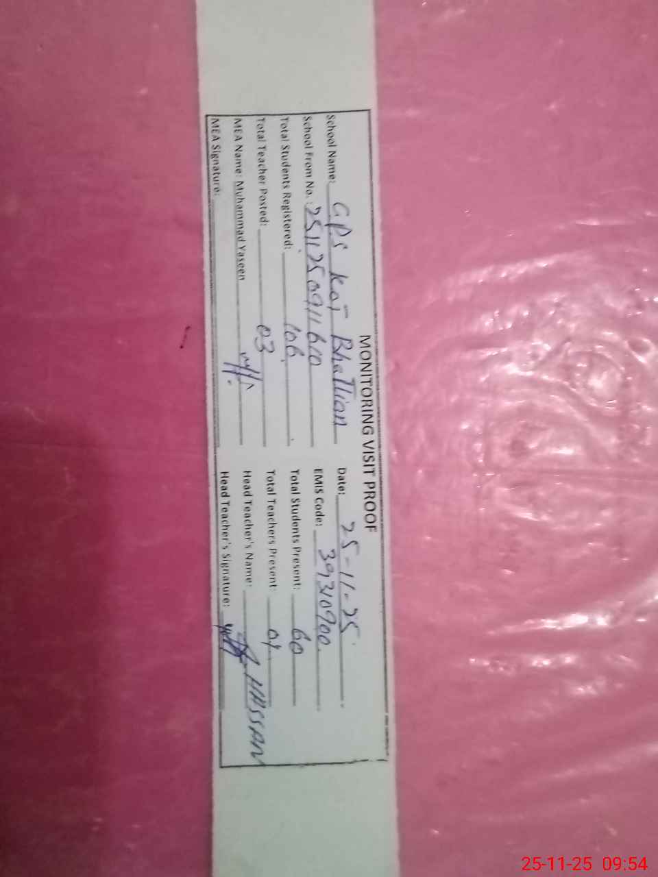 | Attendance Register | Head Teacher | MEA with School | Visit Proof |