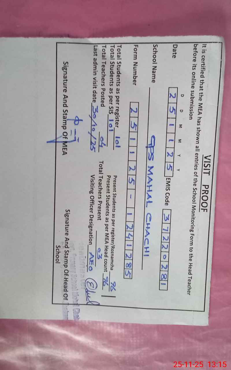 | EMIS Code: 37220281 | Name of School: GPS MAHAL CHAHI | |||