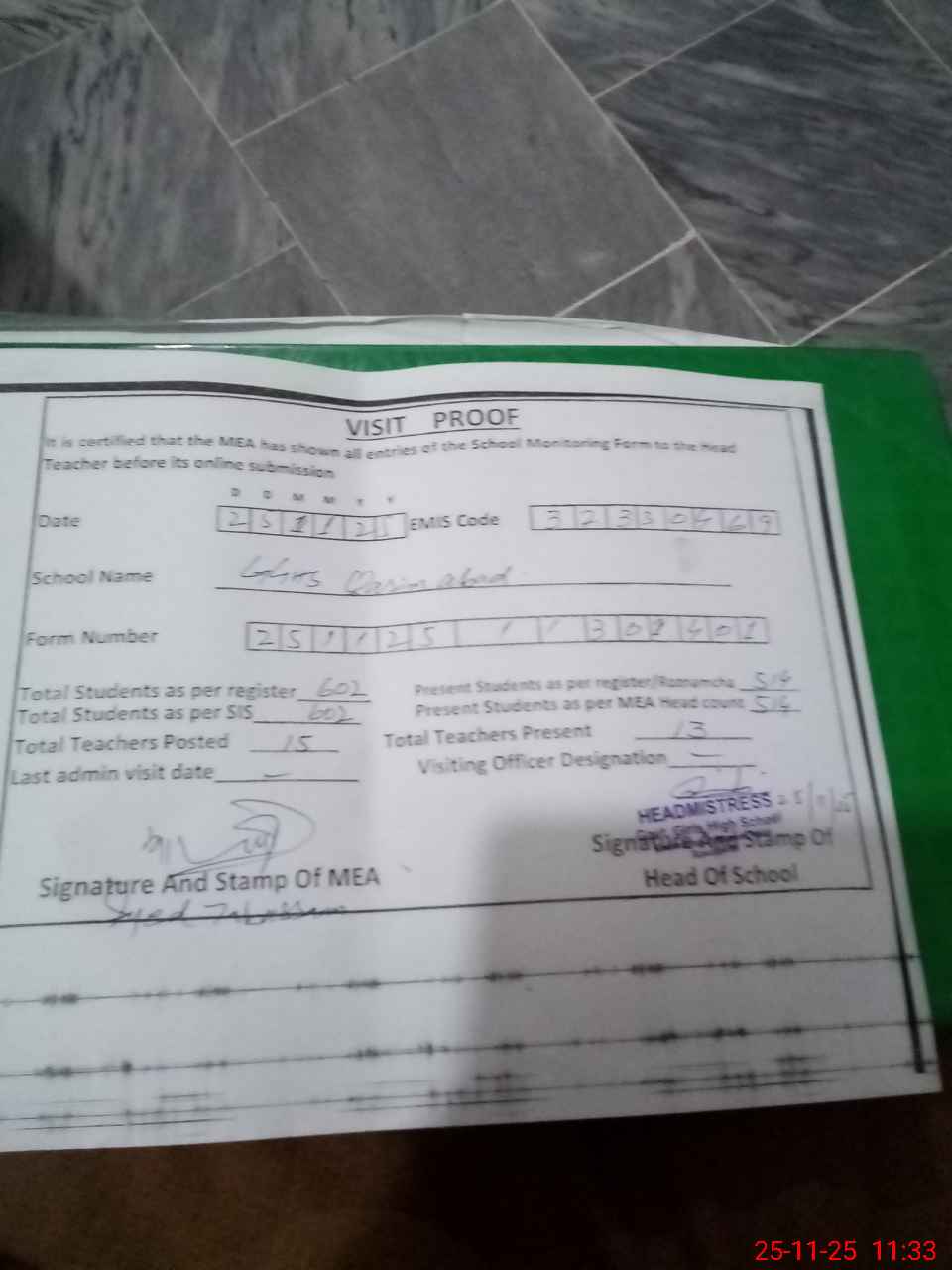 | Attendance Register | Head Teacher | MEA with School | Visit Proof |