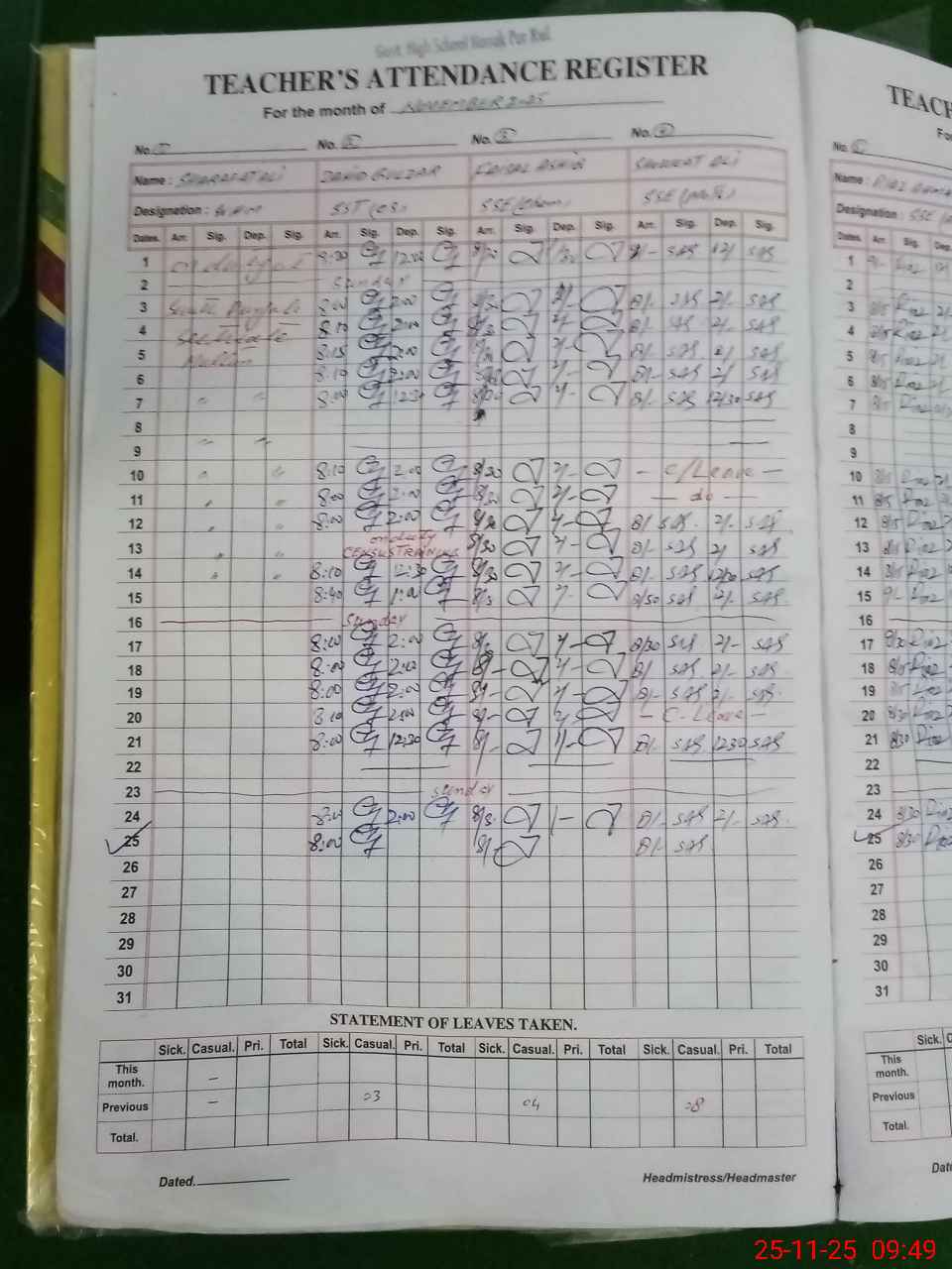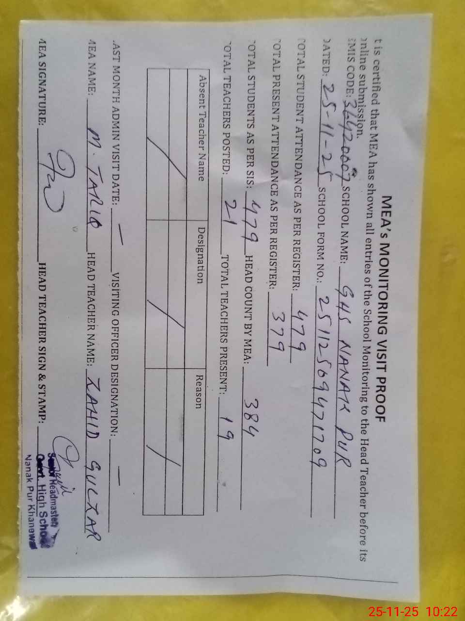 | Attendance Register | Head Teacher | MEA with School | Visit Proof |
